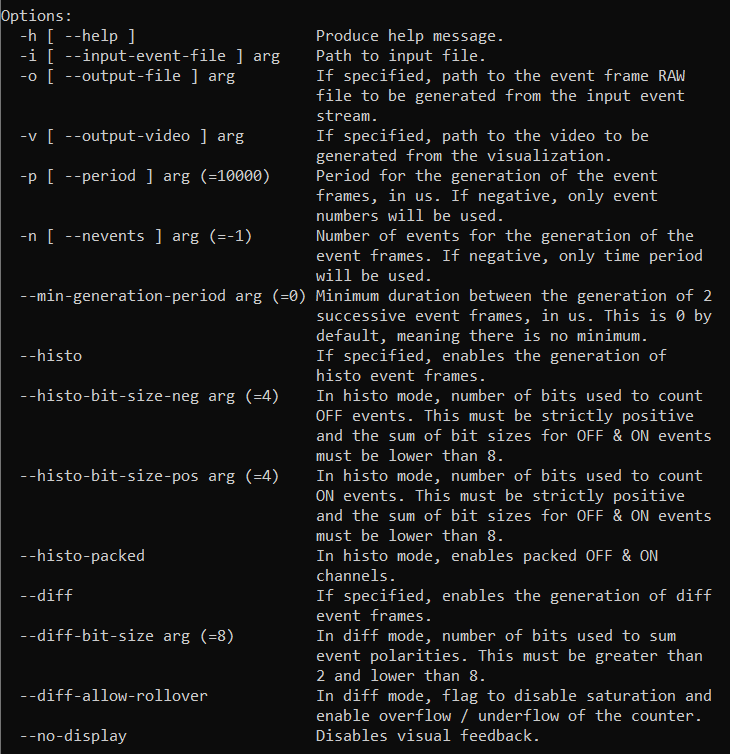 Then, you can use the metavision_event_frame_generation sample to generate event frame RAW files in Histo3D or Diff3D format.