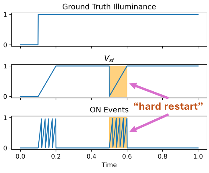 I'm a student at Carnegie Mellon and we're working on a project that needs to measure the events when the illumination of a pixel increases from zero in a static scene (such as instantaneously taking the lens cap off). Currently, we have an EVK4 model. May I know if it would be possible to do a "hard restart of the photodiode voltage/source follower", like the orange-shaded area in the following figure?